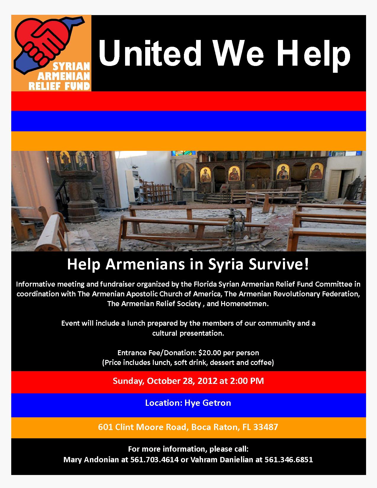 The Florida Syrian Armenian Relief Fund Committee, in coordination with the Armenian Apostolic Church of America, A.R.F., A.R.S., Homenetmen, and FLArmenians has organized an informative meeting and fundraiser on Sunday, October 28th at 2:00 PM.