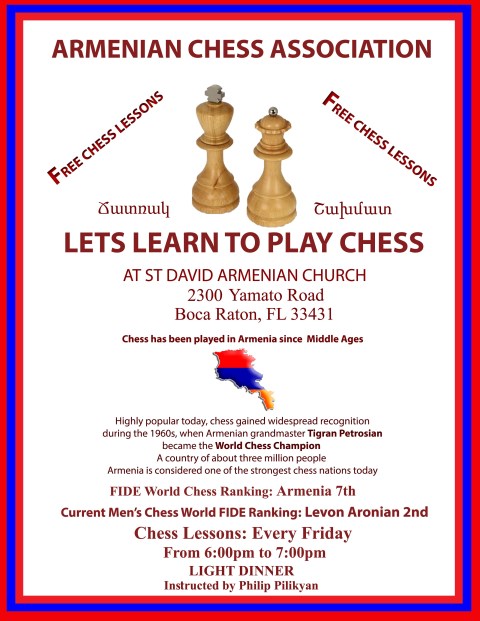 Posted on November 5, 2017, in Armenian Church, Arts & Culture, Events, General Update and tagged Armenian Church, Bingo, Boca Raton, Chess, Ellie Berberian, Fall, New Years Eve, NYE2018, St. David Armenian Church, Women's Guild. Bookmark the permalink. Leave a comment.