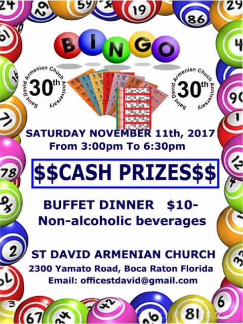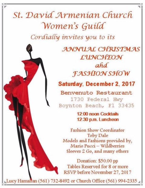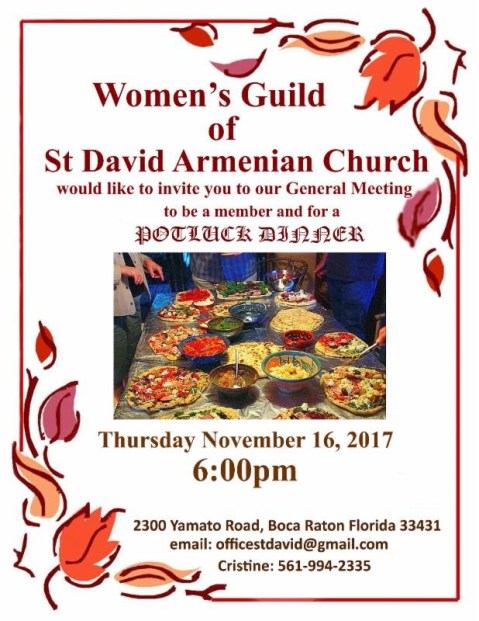 The following Fall events for November and December 2017 will be held at St. David Armenian Church, 2300 Yamato Rd., Boca Raton, FL 33431. To register for an event, contact the Church office at (561) 994-2335 or officestdavid@gmail.com.