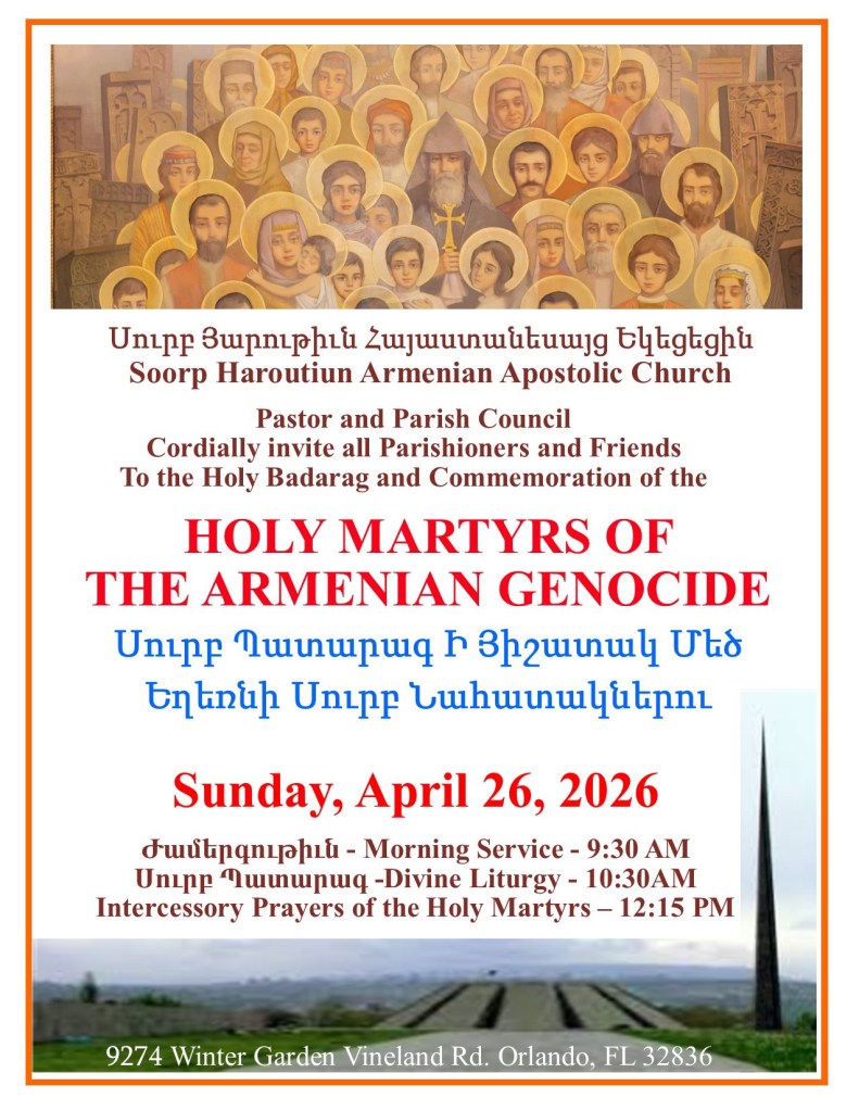 Posted on April 18, 2026, in Armenian Church, Armenian Genocide, General Update and tagged Armenian Church, Armenian Genocide, Orlando, Soorp Haroutiun Armenian Church. Bookmark the permalink. Leave a comment.