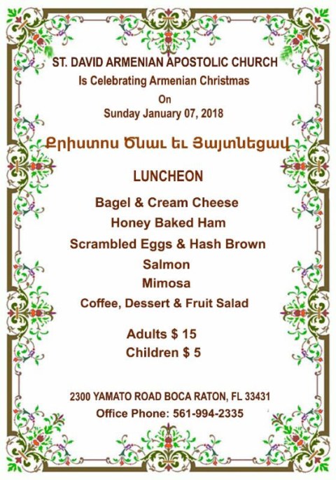 Please Join Us to Celebrate Armenian Christmas, January 7, 2018 – Armenian Christmas Divine Liturgy and Blessing of the Water – 10:30 a.m. Following the Soorp Badarak, please join us for a Farewell Luncheon in honor of Fr. Armash, Yeretzgeen Maran, and Nathaniel. For more information about the luncheon, please call Pat Baligian at (407) 438-8433. Luncheon donations: $10.00 per adult; $5.00 for children (5 to 12 years old); Children under 5 years old are free.