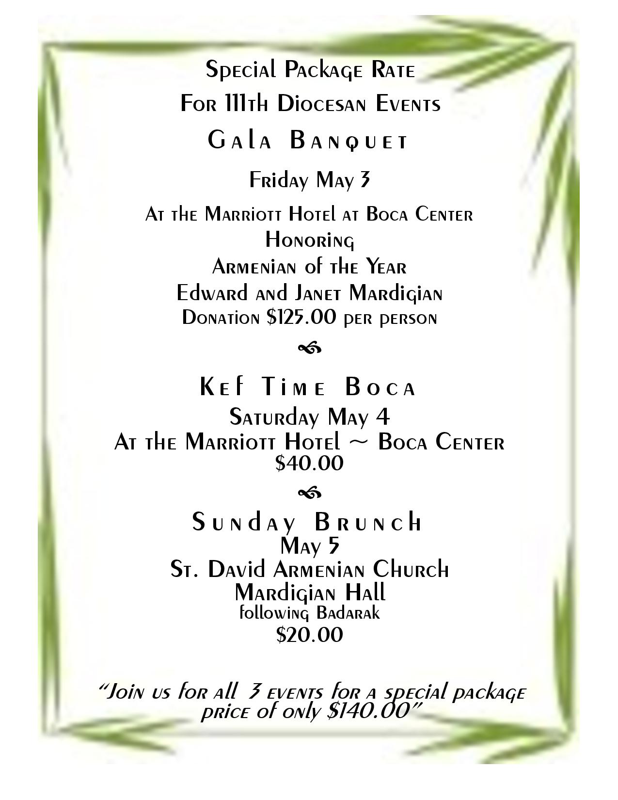 It was a whirlwind week of events with hundreds of attendees from Mid-Western, East Coast, and Southern states. In addition to the planned sessions and meetings, guests participated in luncheons, kef time (featuring the music of Johnny Berberian), area sightseeing, and a gala banquet honoring Armenians of the Year – Janet and Edward Mardigian, and Friend of the Armenians – former Florida Governor Jeb Bush. The week-long gathering culminated with a lavish farewell Sunday brunch for departing Very Rev. Fr. Nareg Berberian of St. David Armenian Church.