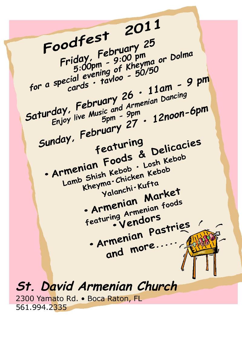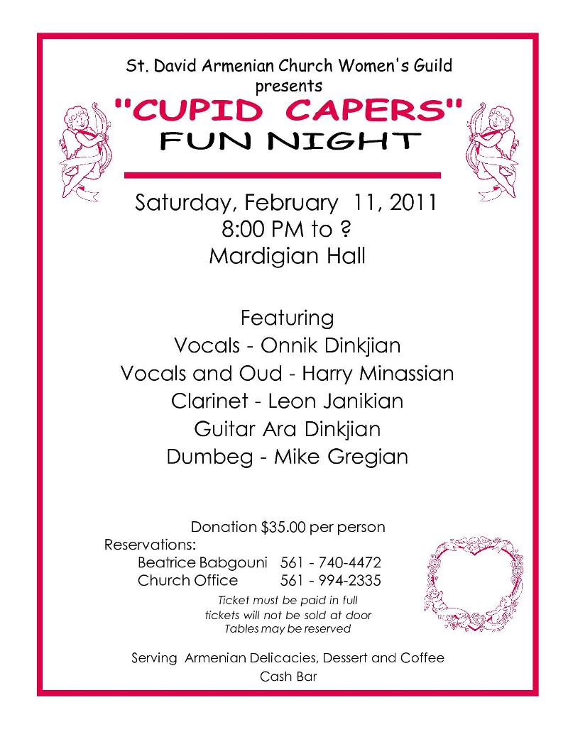 This time of year is filled with fund-raising events at St. David Armenian Church, Boca Raton, FL.- especially the month of February. To kick-off the fun-filled month, the Women’s Guild is sponsoring “Cupid Capers” Fun Night on February 11, serving Armenian delicacies and desserts, while Onnik Dinkjian, Harry Minassian, Leon Janikian, Ara Dinkjian, and Mike Gregian provide the best-ever musical entertainment. (Sorry, tickets will not be sold at the door.)