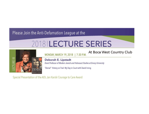On Monday, March 19th, the Anti-Defamation League (ADL) 2018 Lecture Series will welcome Professor Deborah Lipstadt, Dorot Professor of Modern Jewish History and Holocaust Studies at Emory University for “Denial – History on Trial: My Day In Court With David Irving.”