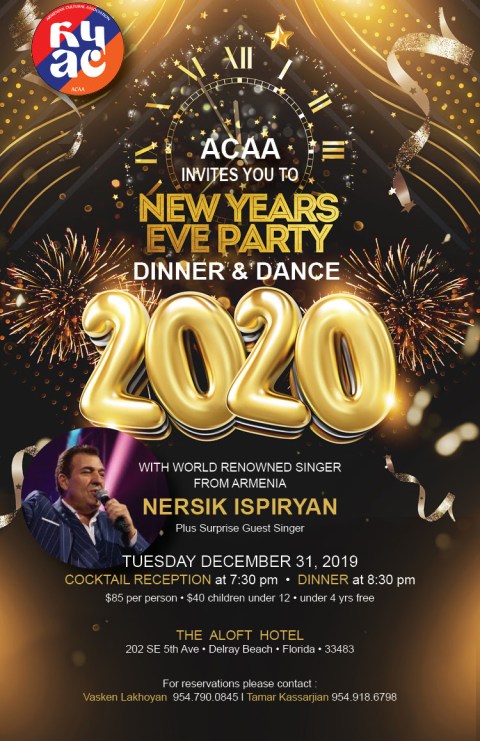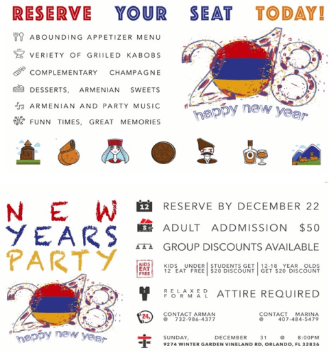 The New Year’s Eve Celebration at Soorp Haroutiun Armenian Church of Orlando will be held at 9274 Winter Garden Vineland Rd., Orlando, FL 32836 from 8:00 pm to 1:00 am.