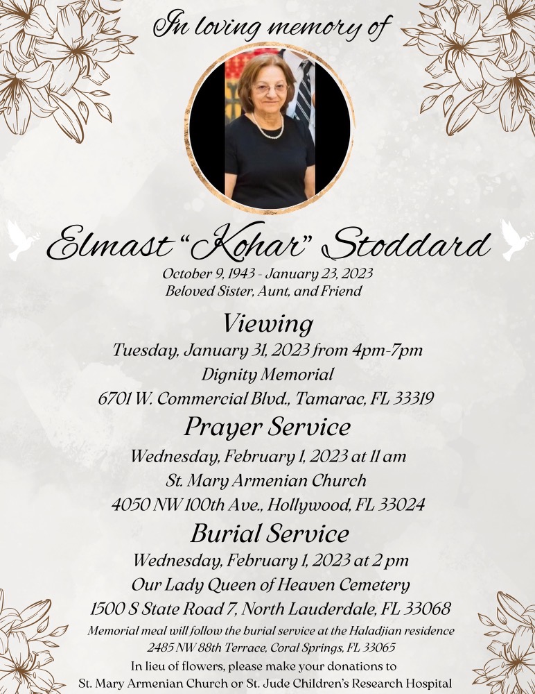 The funeral service will be Wednesday, February 1, 2023 from 11:00 AM to 12:45 PM at St Mary Armenian Apostolic Church, 4050 NW 100th Ave, Hollywood, FL 33024 with the burial to follow at 2:00 PM at Our Lady Queen of Heaven, 1500 S State Road 7, North Lauderdale, FL 33068.