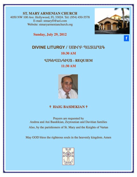 In a directive issued earlier this week, Diocesan Primate Archbishop Khajag Barsamian requested that parishes of the Eastern Diocese remember Archbishop Aghan Baliozian through a hokehankisd service on Sunday, September 30.