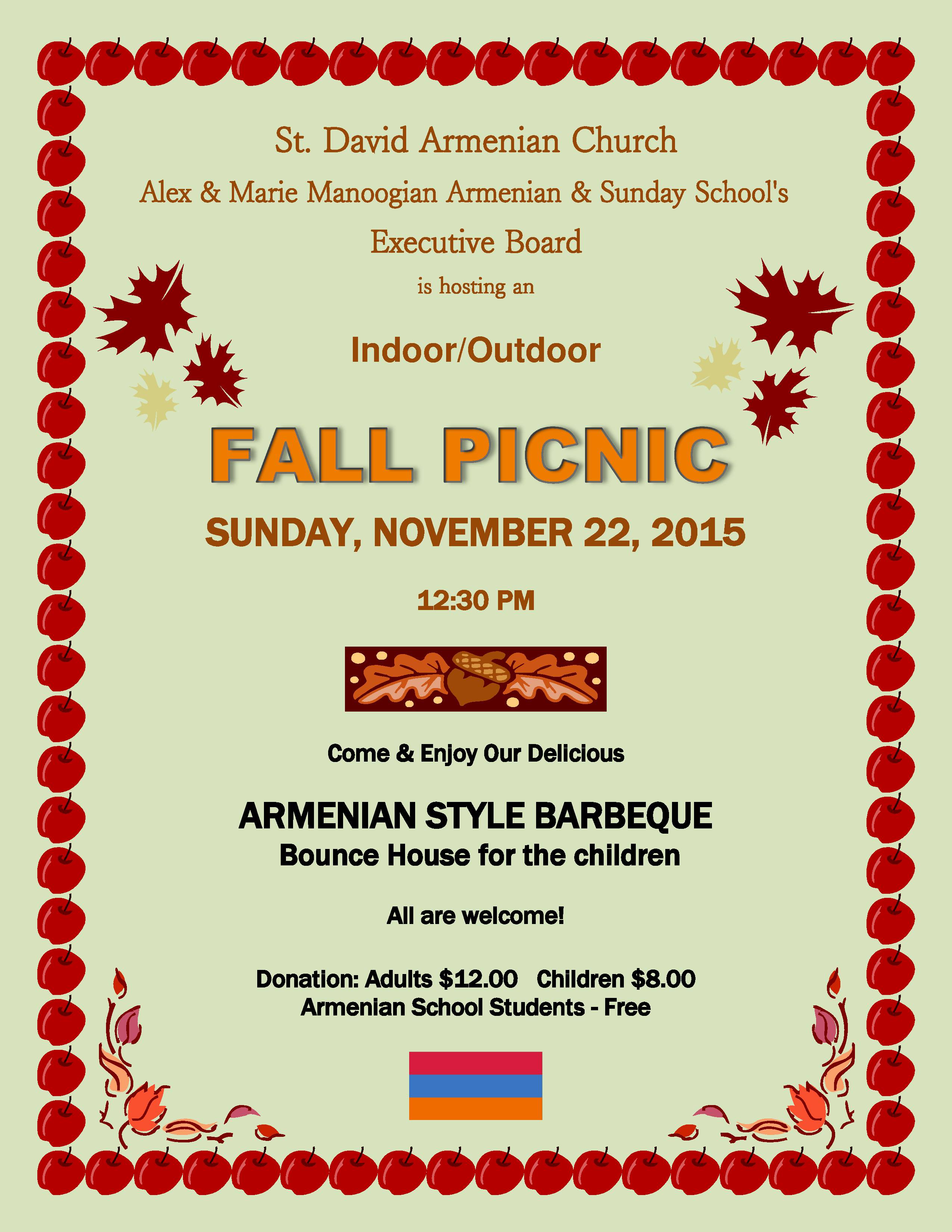 On Sunday, November 22nd, St. David Armenian Church in Boca Raton is hosting their first indoor/outdoor Fall Picnic. Come and enjoy delicious Armenian Style BBQ and other delicacies. They will have a bounce house and other fun and games for children. Florida Armenians encourages you to bring your entire family and friends for an afternoon full of fun, joy and delicious Armenian BBQ!