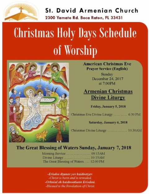 Please Join Us to Celebrate Armenian Christmas, January 7, 2018 – Armenian Christmas Divine Liturgy and Blessing of the Water – 10:30 a.m. Following the Soorp Badarak, please join us for a Farewell Luncheon in honor of Fr. Armash, Yeretzgeen Maran, and Nathaniel. For more information about the luncheon, please call Pat Baligian at (407) 438-8433. Luncheon donations: $10.00 per adult; $5.00 for children (5 to 12 years old); Children under 5 years old are free.