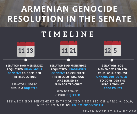 - On November 21, Senator Bob Menendez requested Unanimous Consent again to consider S.Res.150, and was joined by Senator Ted Cruz. Senator David Perdue (R-GA) objected, citing “ongoing diplomatic relations with Turkey.” Senator Menendez vowed not to relent.